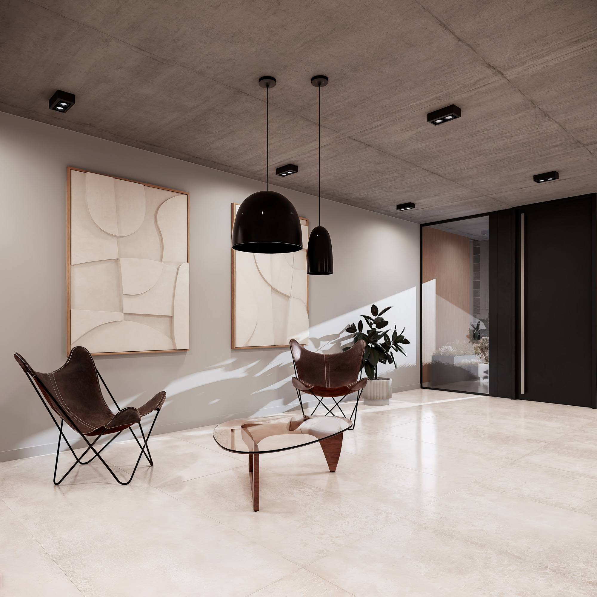 - Hall de acceso con revestimientos en porcelanato símil mármol y diseño de vanguardia con entrada semicubierta.