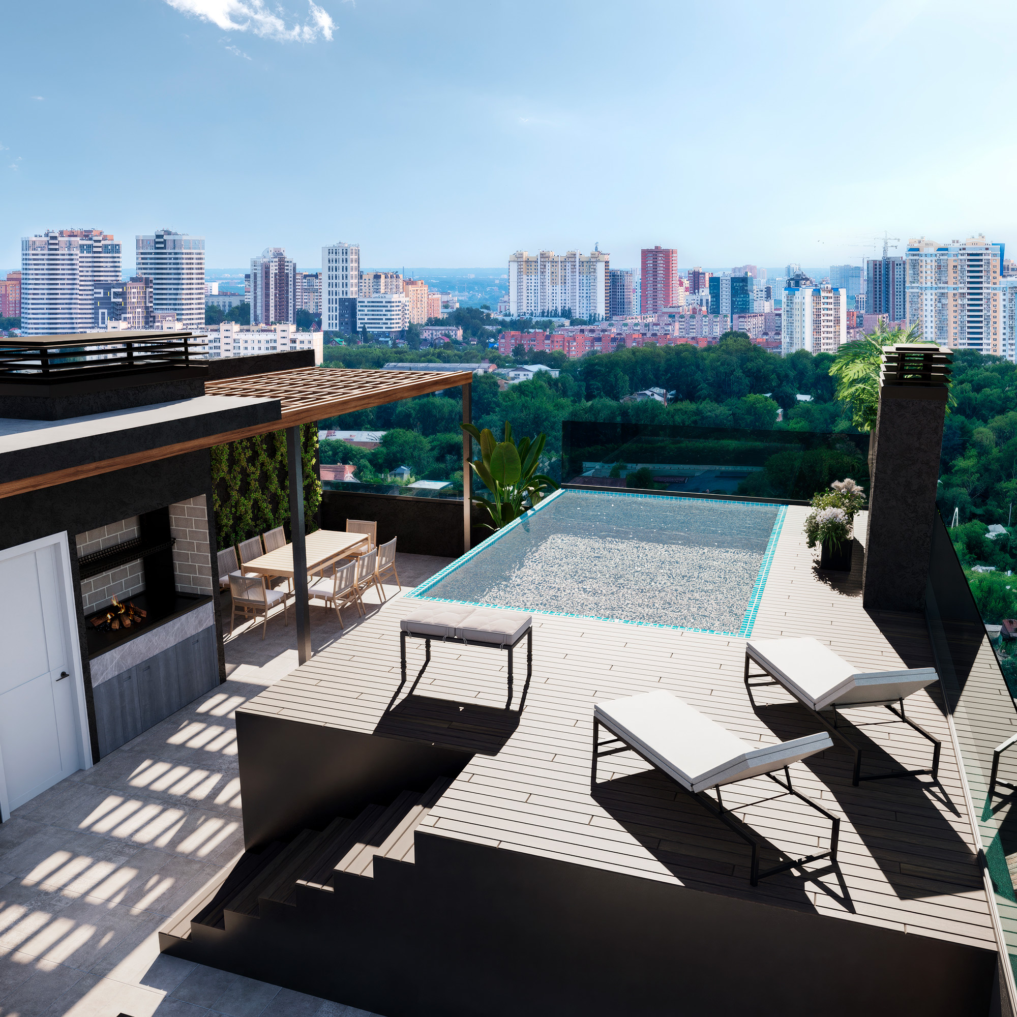 Ubicados en el último nivel, el edificio cuenta con piscina, solarium, parrilla, sanitarios y un espacio de usos múltiples o comedor bajo una gran pérgola. Además cuenta con espacios para guardar bicicletas en subsuelo.